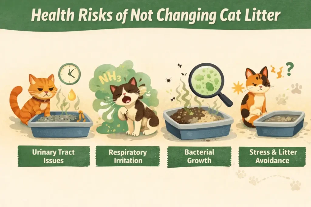 Delaying litter changes doesn’t just cause odor, it can affect your cat’s health and behavior. When litter becomes saturated, ammonia from urine builds up quickly. In enclosed spaces, this can irritate both cats and humans. Here are the main risks: