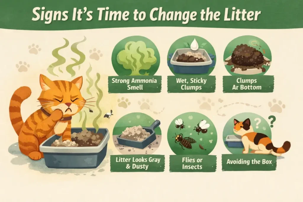 Even if you’re following a regular schedule, some situations require changing the litter earlier. Cats are extremely sensitive to smell and texture, and small changes can make them avoid the box altogether. Watch for these signs: