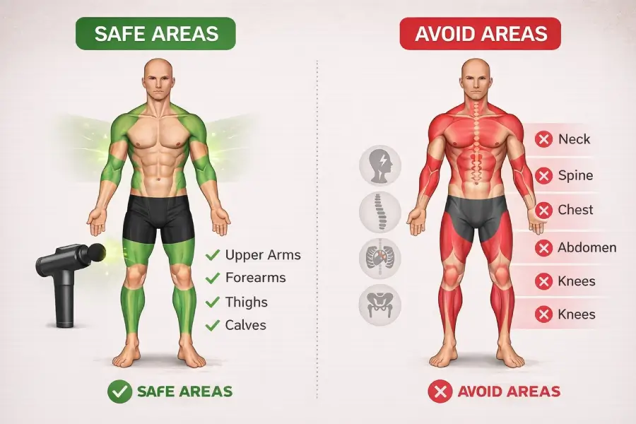 You can safely use a massage gun on large back muscles (upper back and lower back muscles only), but avoid the spine, neck front, and bony areas. For the neck and shoulders, use low intensity and soft attachments.
